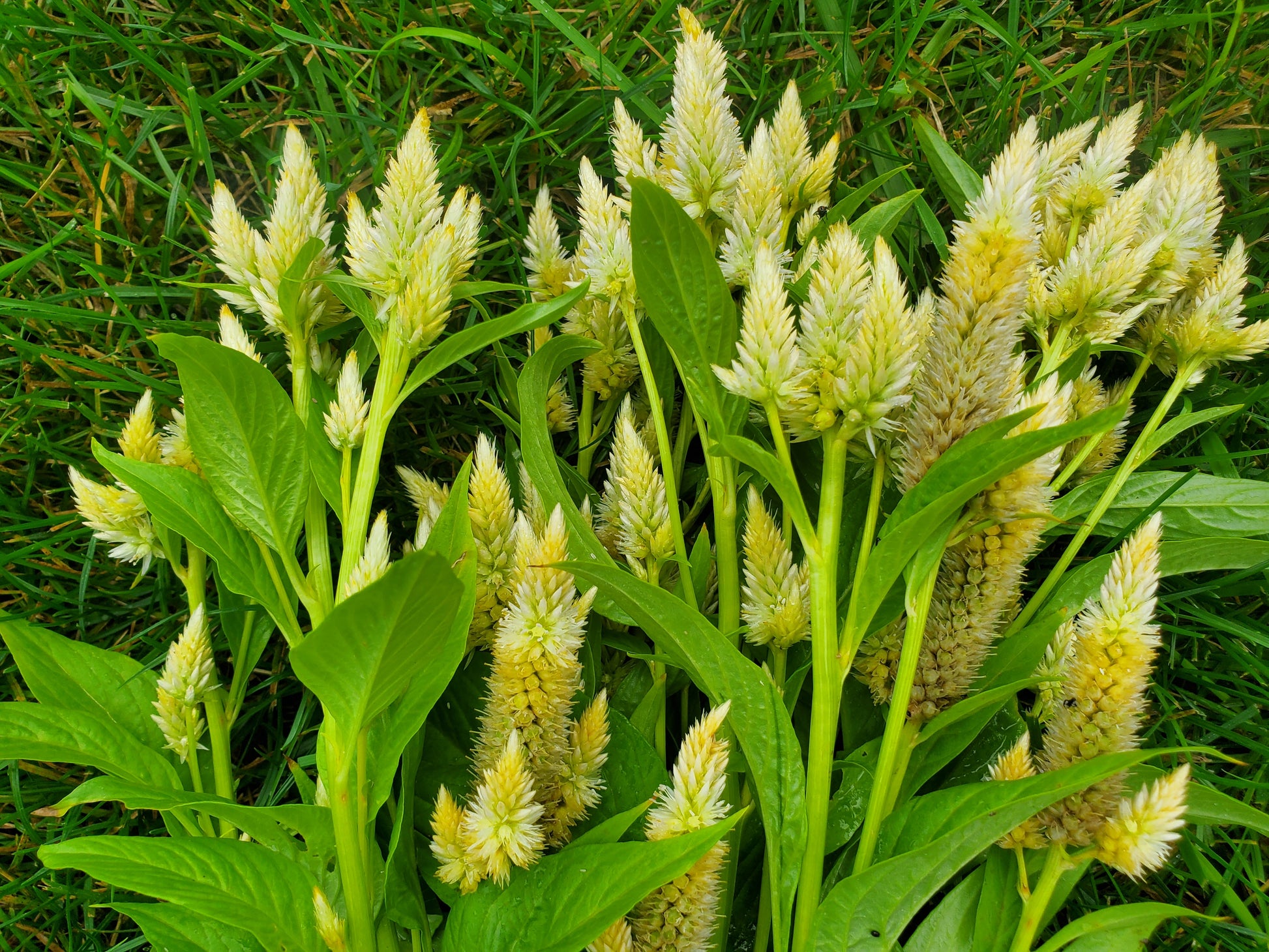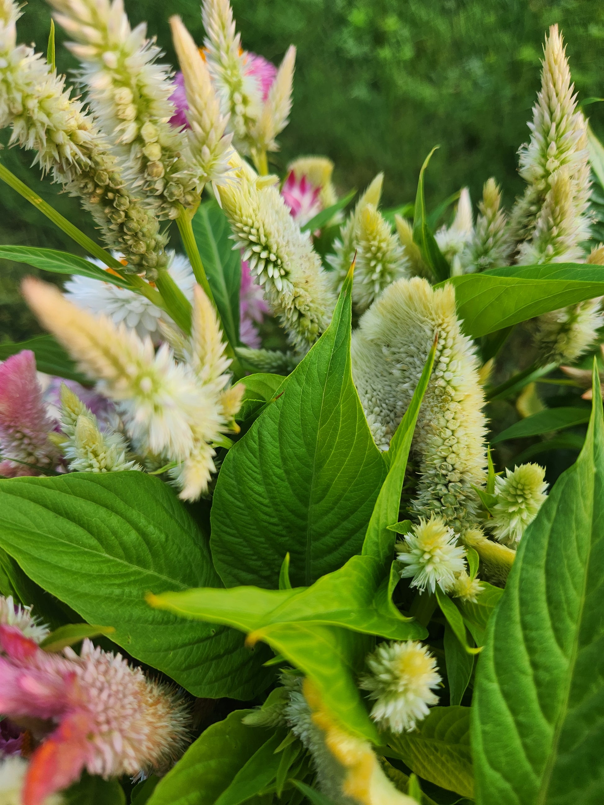 A mix of crest and spike celosia in shades of cream, ivory, pale yellow, and faintest blush. Stems are 18"+.