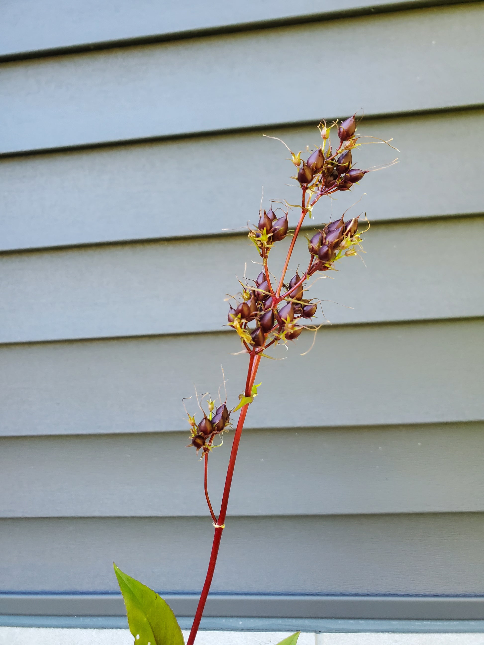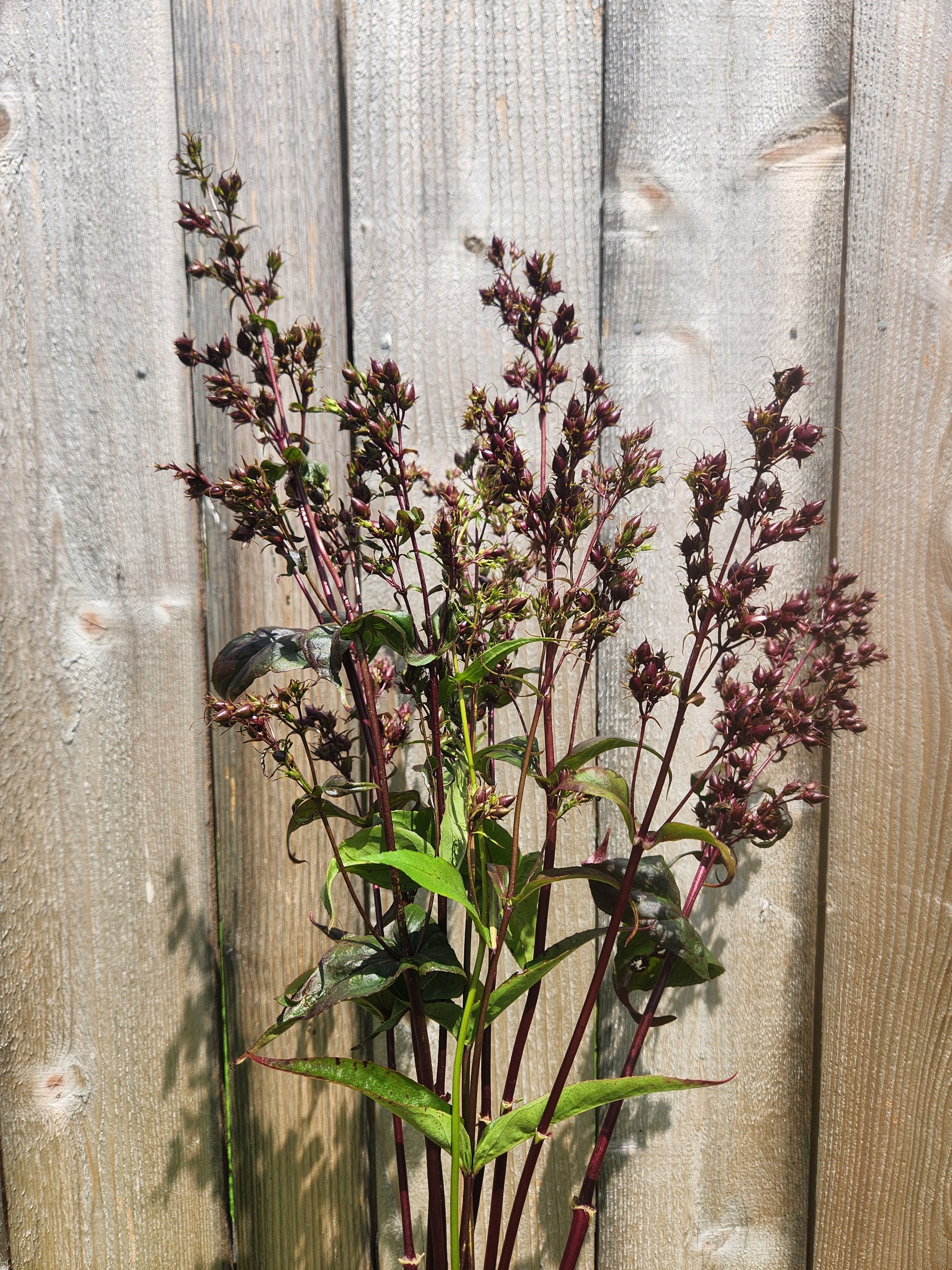 Interesting burgundy seed pods on stiff stems. Long lasting. Stems are usually 18"+.