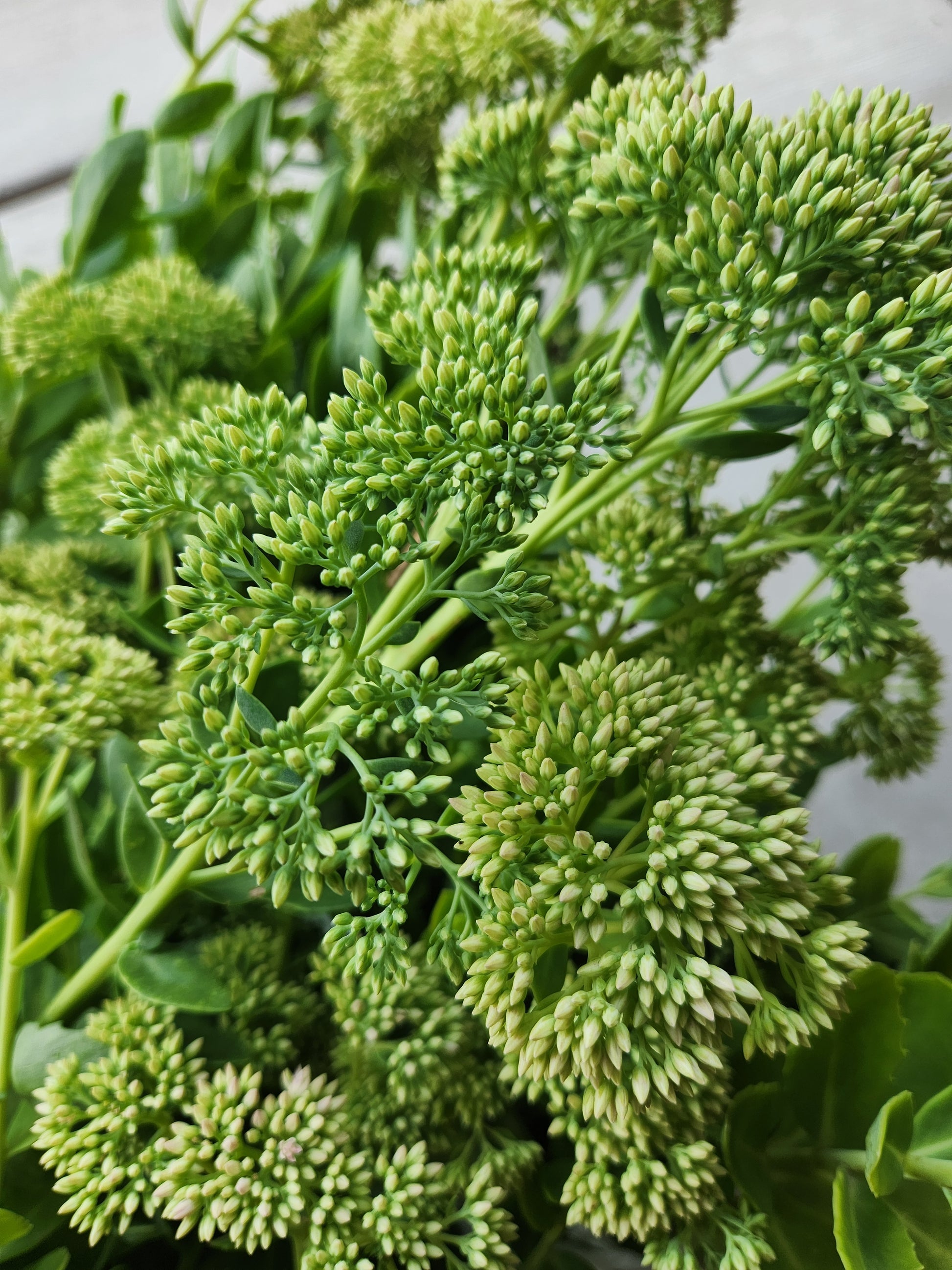Green branching buds of garden sedum. Long vase life. Stems are roughly 16"+