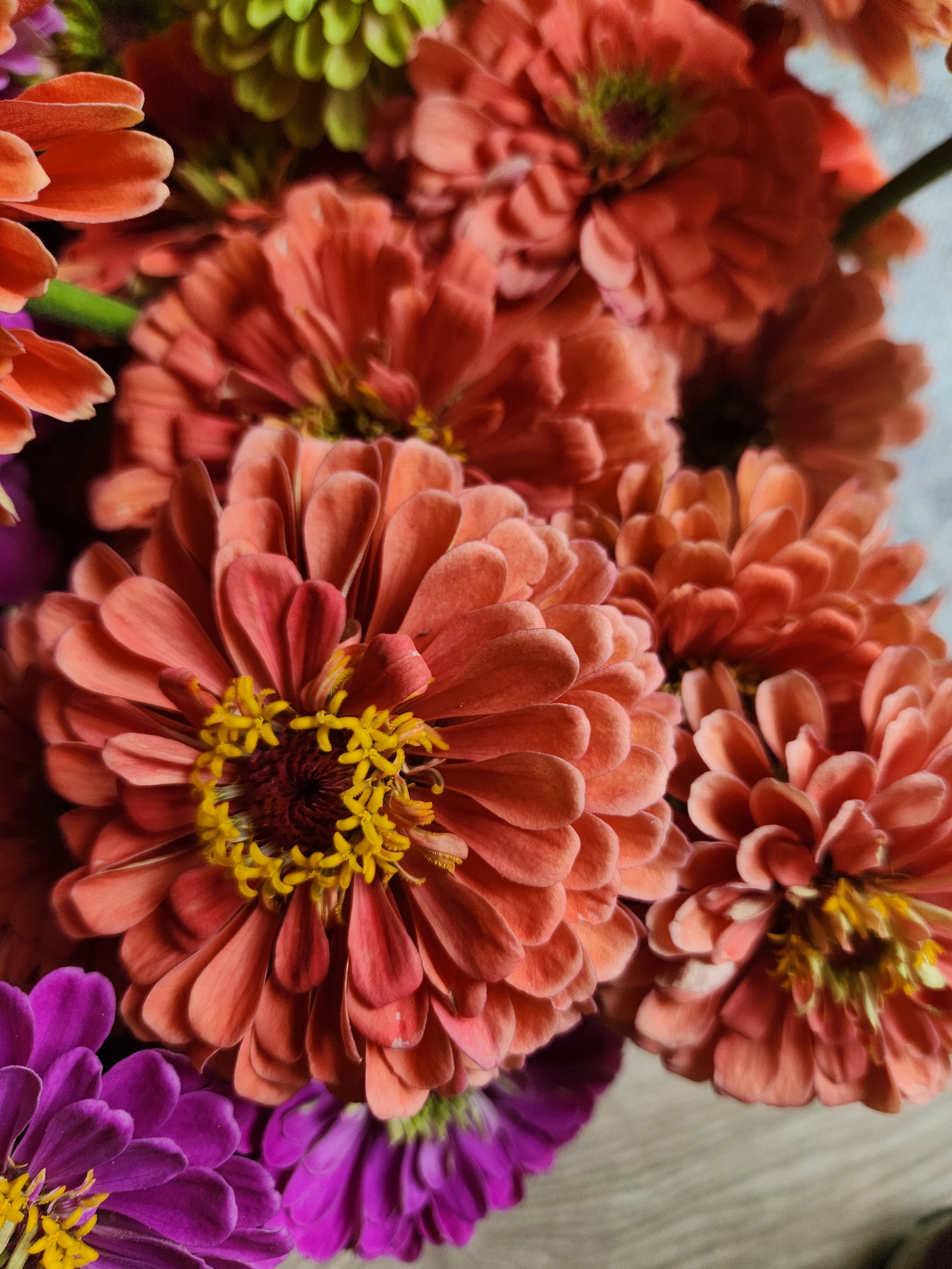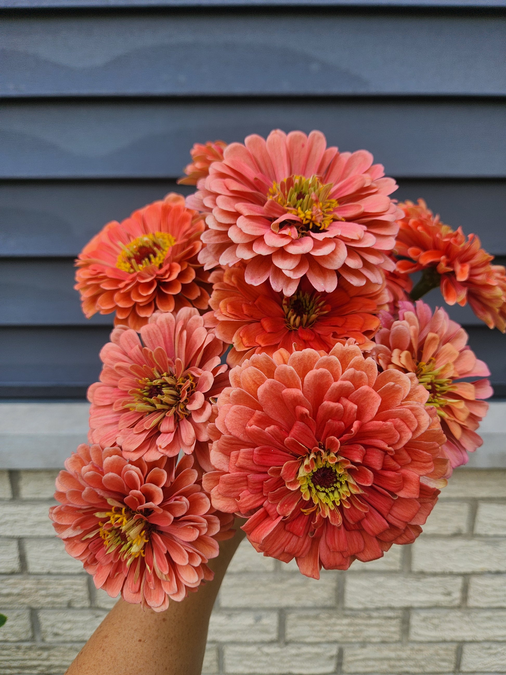 Large mostly double zinnias. Stems are still on the short side this early in the season, but will be 16"+.