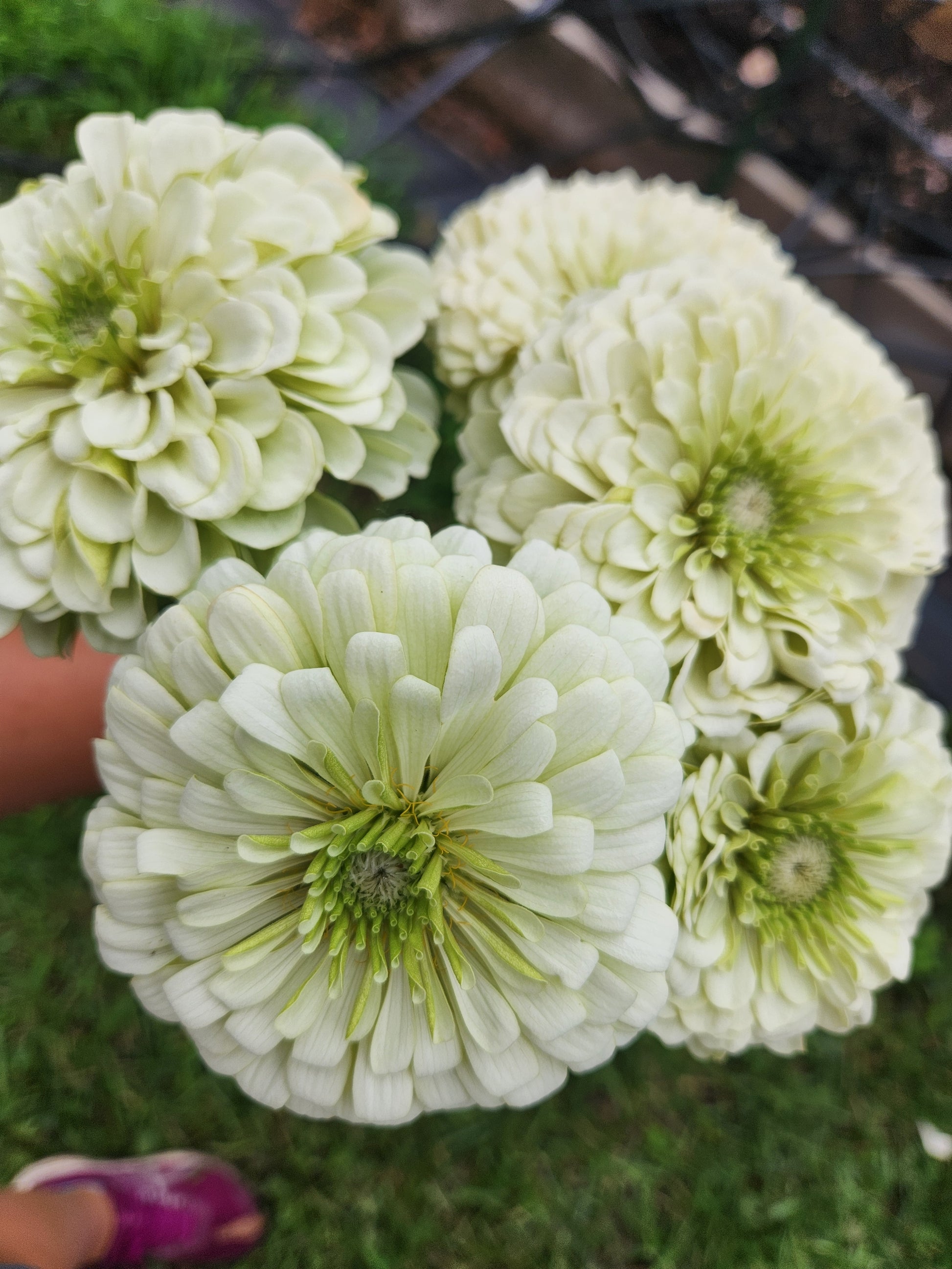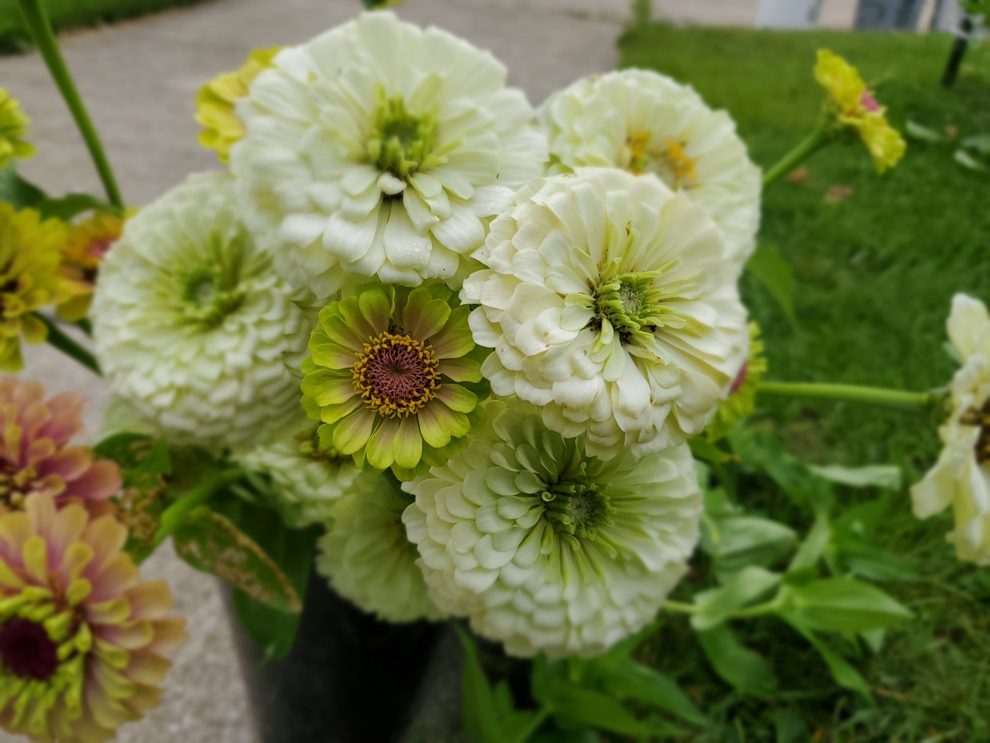 Large mostly double zinnias. Stems are still on the short side this early in the season, but will be 16"+.
