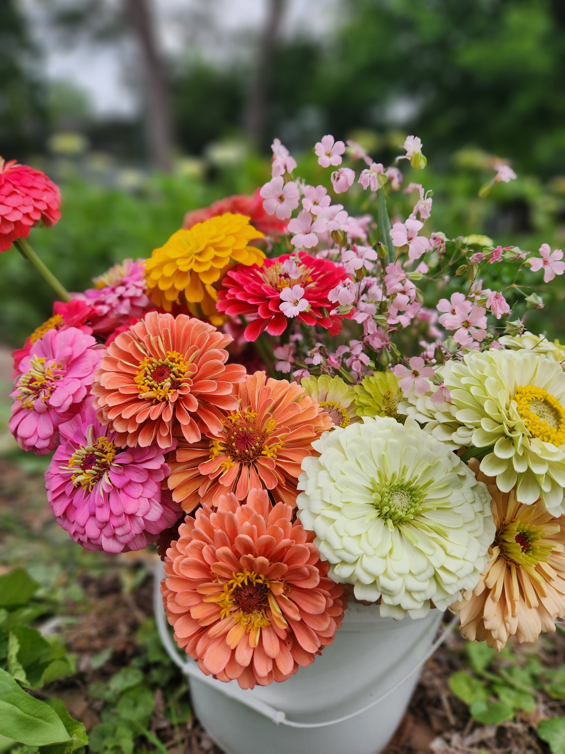 Large mostly double zinnias. Stems are still on the short side this early in the season, but will be 16"+.