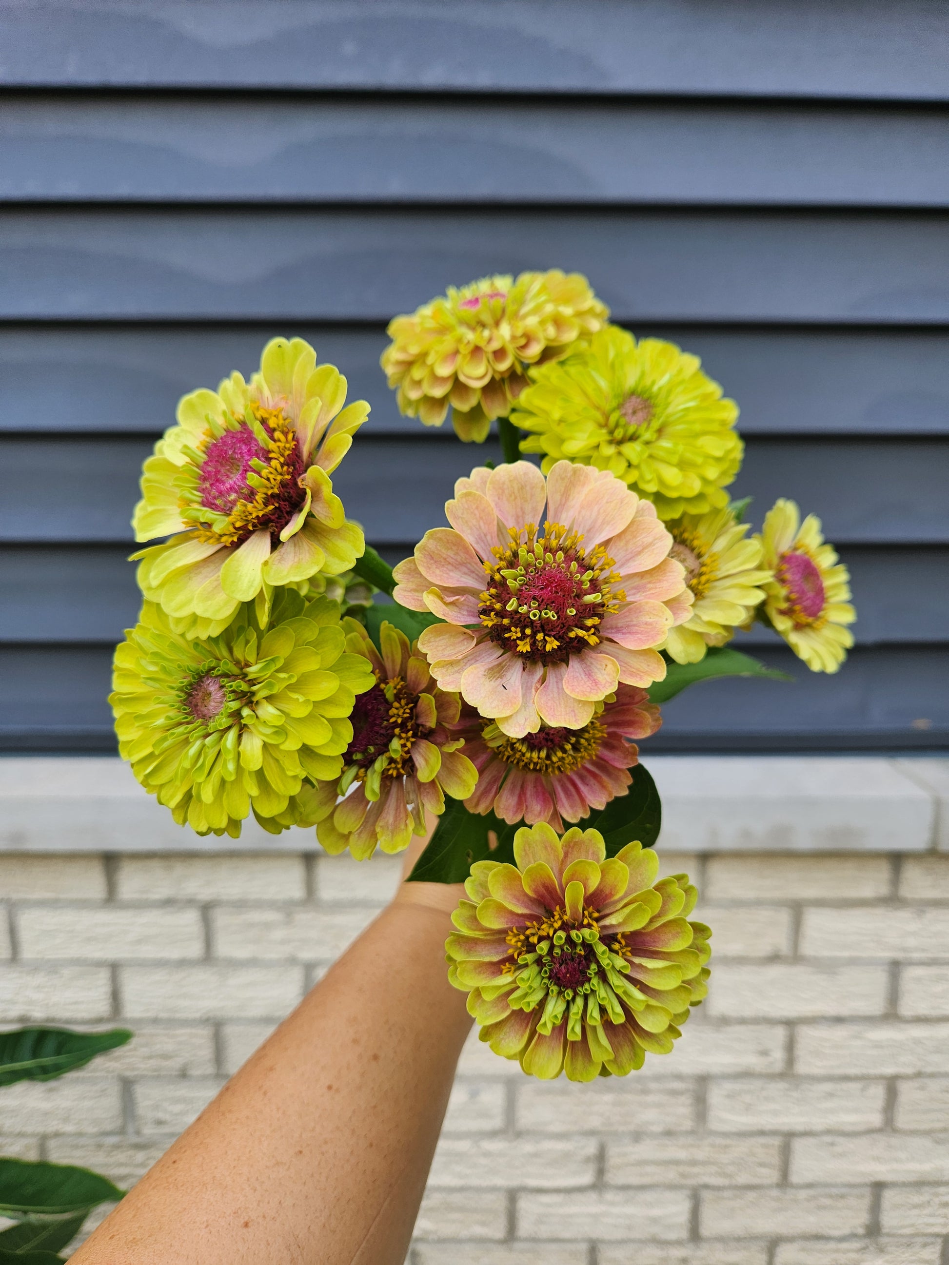 Medium/small sized, mostly double zinnias. Stems are still on the short side this early in the season, but will be 16"+.